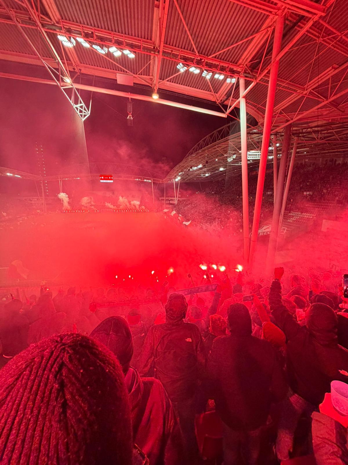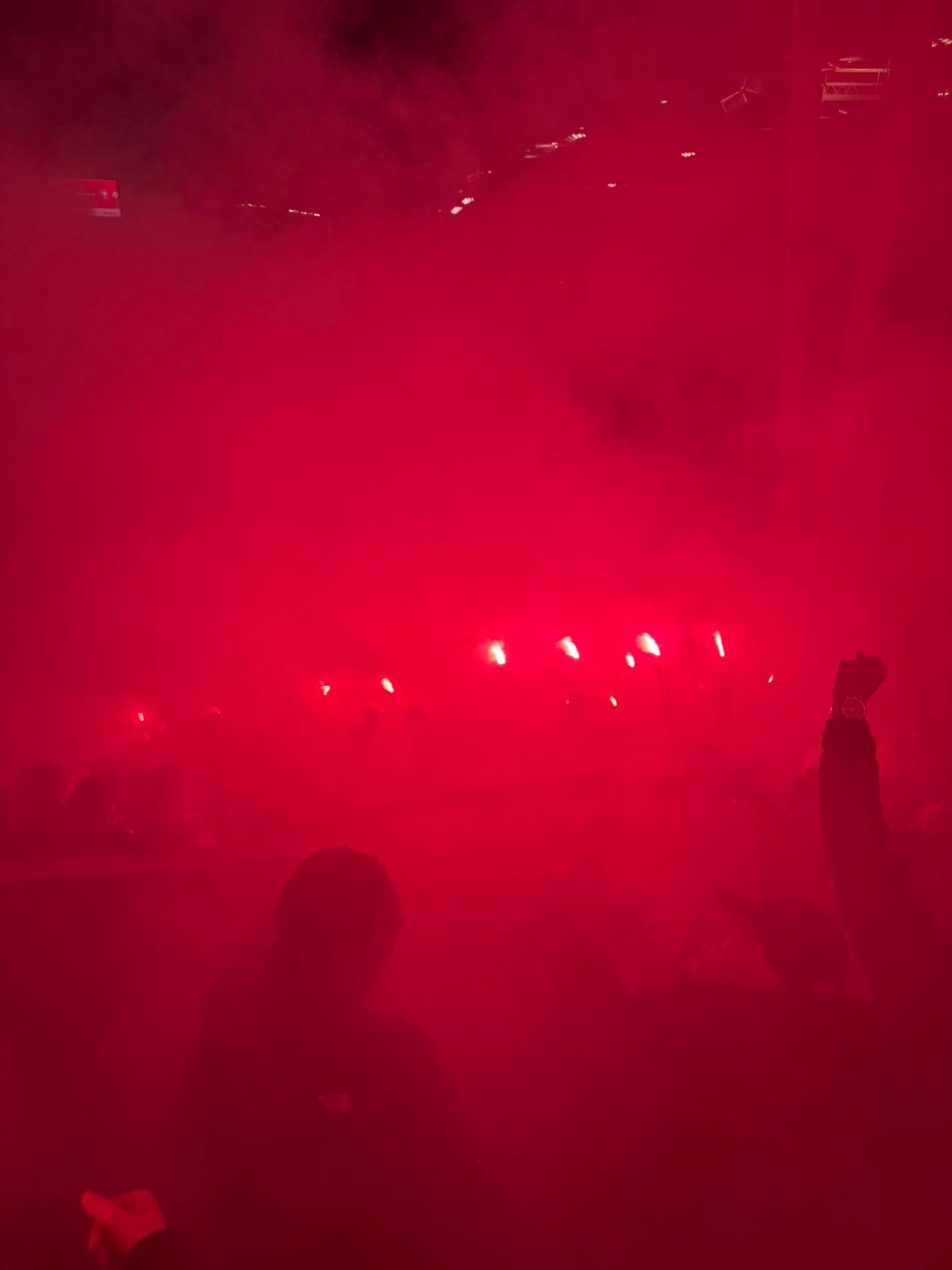 Vlak voor het begin van de wedstrijd kleurde het hele uitvak namelijk helemaal rood. Met een heerlijke pyro gaven de Twentse supporters de spelers van trainer John van den Brom een laatste steuntje in de rug voor het bekerduel in Stadion Galgenwaard.